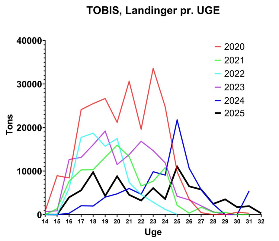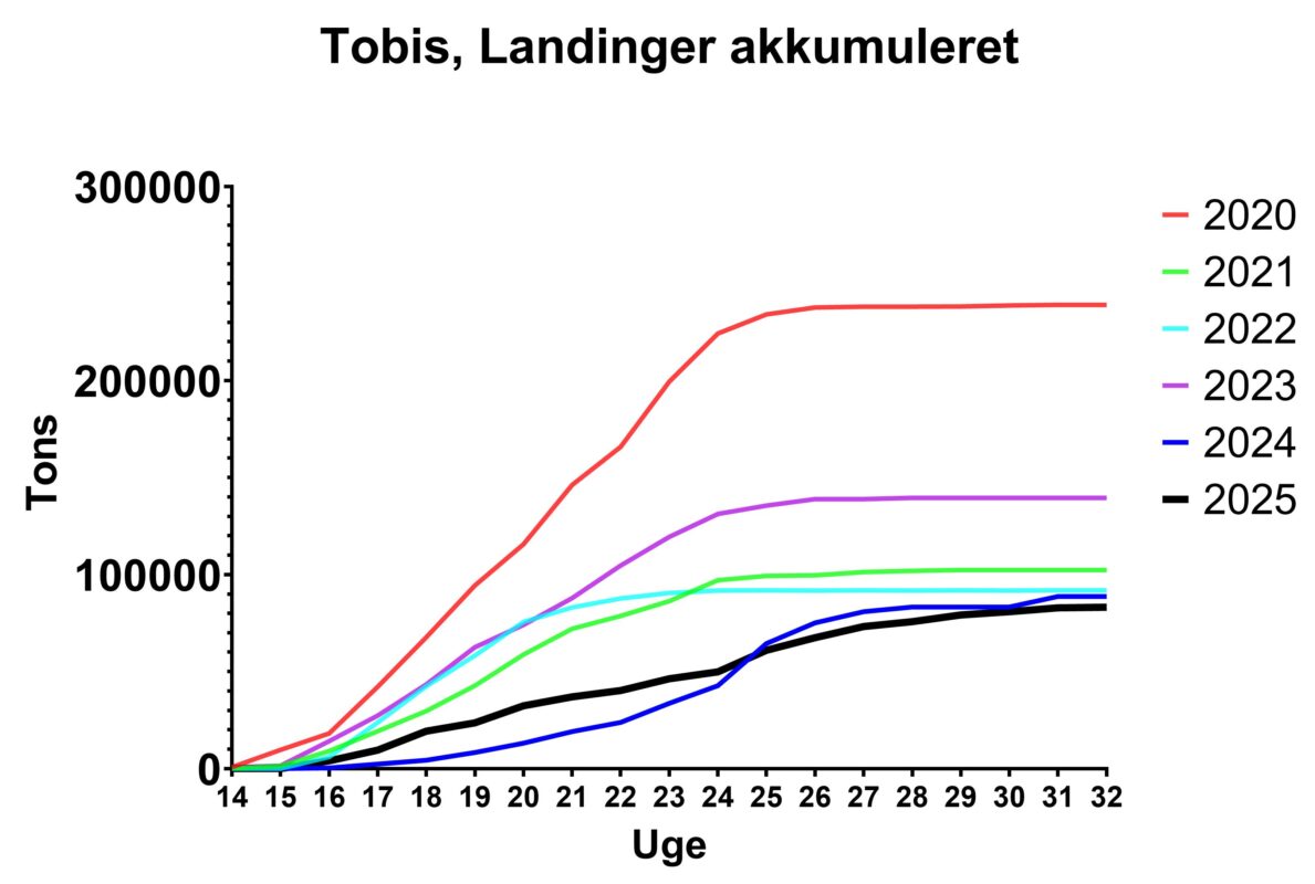 Samtidig var der også positive udviklinger, der viser fiskeriets modstandsdygtighed. Kvoten for europæisk tobisfiskeri i 2025 blev fastsat til 110.078 tons, og selvom de samlede landinger var lidt lavere end i 2024, var udnyttelsen af kvoten betydeligt højere. Fartøjerne landede i Danmark for 85.101 tons, mens der i Norge blev landet 20.187 tons. Sammen udgjorde dette 105.288 tons eller 96% af den samlede kvote. Til sammenligning blev kun ca. 60% af kvoten landet i 2024. På trods af de omfattende lukninger i britiske farvande var europæiske fiskere derfor i stand til at udnytte kvoten mere effektivt i år.